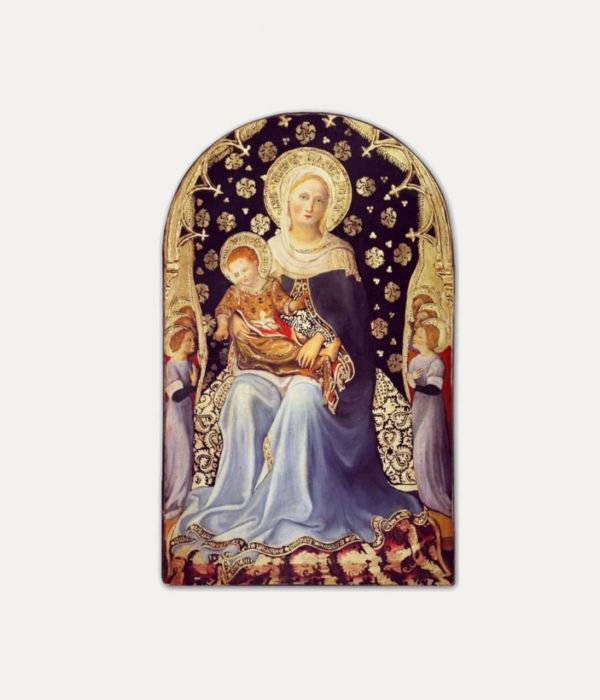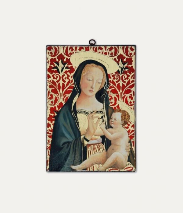The work shows the Madonna seated half-length with the Child in her lap who is about to embrace her. Iconographically it is usually referred to a derivation of the Grand Duke's Madonna, with a lively interaction between mother and son in gestures. The bust of Mary is rotated to the right, while the body of Jesus twists in the opposite direction, wrapping his mother around his neck affectionately. The gazes of both are turned to the viewer and their faces are created by analogies, starting with the soft blonde hair of both. Further away, the mist makes everything very clear, in blue tones.