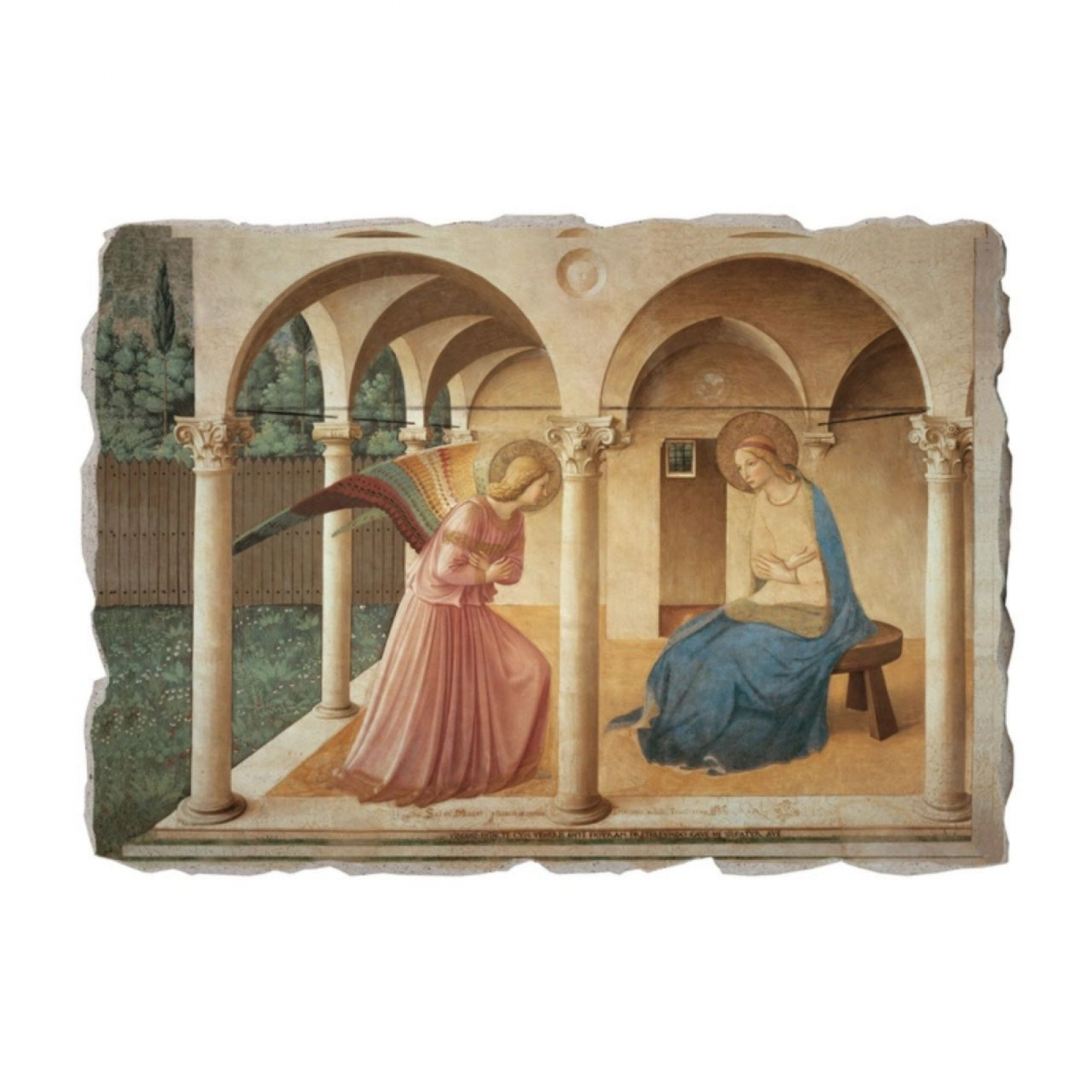The architecture is more than ever set to simple Renaissance elegance, with the vanishing point inside the portico itself and with the columns more massive than usual. The setting is bare and essential, like the small room that opens behind the virgin. The only decorative note is given by the capitals, rendered with a strong emphasis on light, and are both Ionic and Corinthian: a reference to the architectural orders treated by Leon Battista Alberti in his works. An element of innovation is the arrangement of the protagonists along a diagonal, thus participating more effectively in the space. The words of the Annunciation are painted at the bottom, near the base of the central column, more or less at the viewer's eye level.