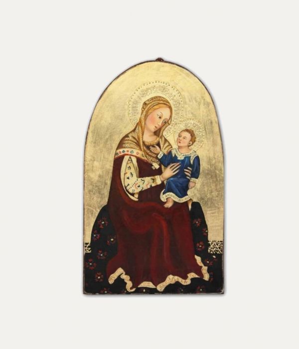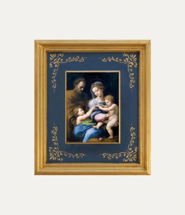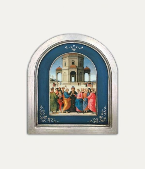 The work follows ancient iconographic models, such as splitting the scene into two successive moments: the Nativity and the First Bath of the Child performed by two women, one of whom is evidently Salome, the skeptical midwife mentioned in the apocryphal Gospels, with a meaning that seems to anticipate the Baptism of Christ, just as the manger refers to the death and resurrection of the Lord. Joseph is secluded and thoughtful; Mary is sitting on a mattress and holds the Child who is clutched in swaddling clothes with her arms, and rays of gold fall on him. Under the slender hut, there is an elongated crib with animals and a circle of angels in adoration. Behind stands a high barren mountain, also with well-known Christmas symbolism, angels and shepherds.