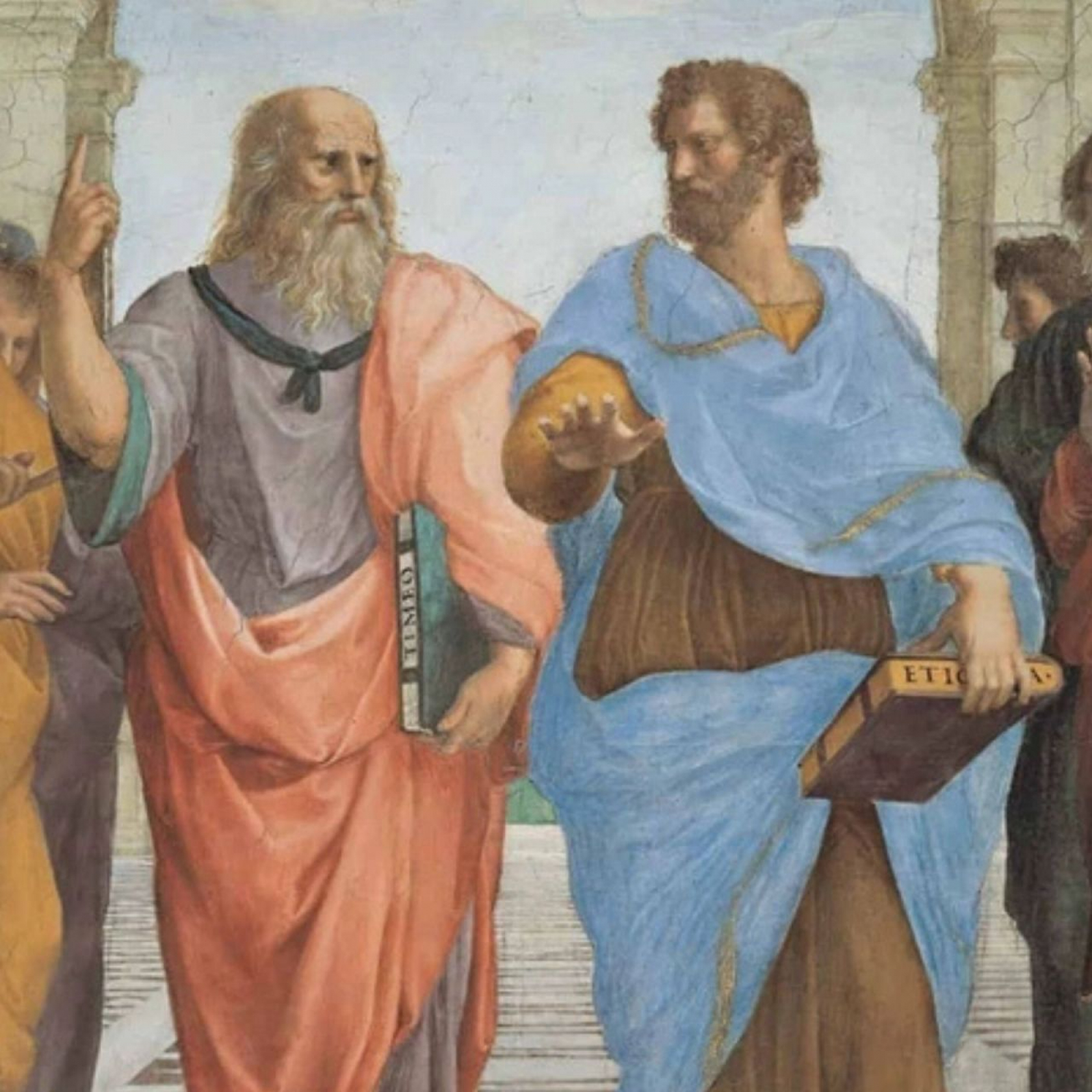 The fresco, framed by a painted arch, represents the most famous philosophers and mathematicians of antiquity intent on dialoguing with each other, inside an imaginary classical building, represented in perfect perspective. The figures are basically arranged in a book, that is, on two floors defined by a wide staircase that cuts through the entire scene. A first and more numerous group is arranged on either side of a central pair of conversing figures, identified as Plato and Aristotle. A second autonomous group, in which the thinkers interested in the knowledge of nature and celestial phenomena have been identified, is arranged in the foreground on the left, while a third, also independent, restricted and symmetrically arranged to the second, is difficult to identify the intellectual sphere, despite the efforts of scholars; clue is the presence of a figure identified as Euclid (or Archimedes, in the guise of Donato Bramante) intent on tracing a geometric demonstration.