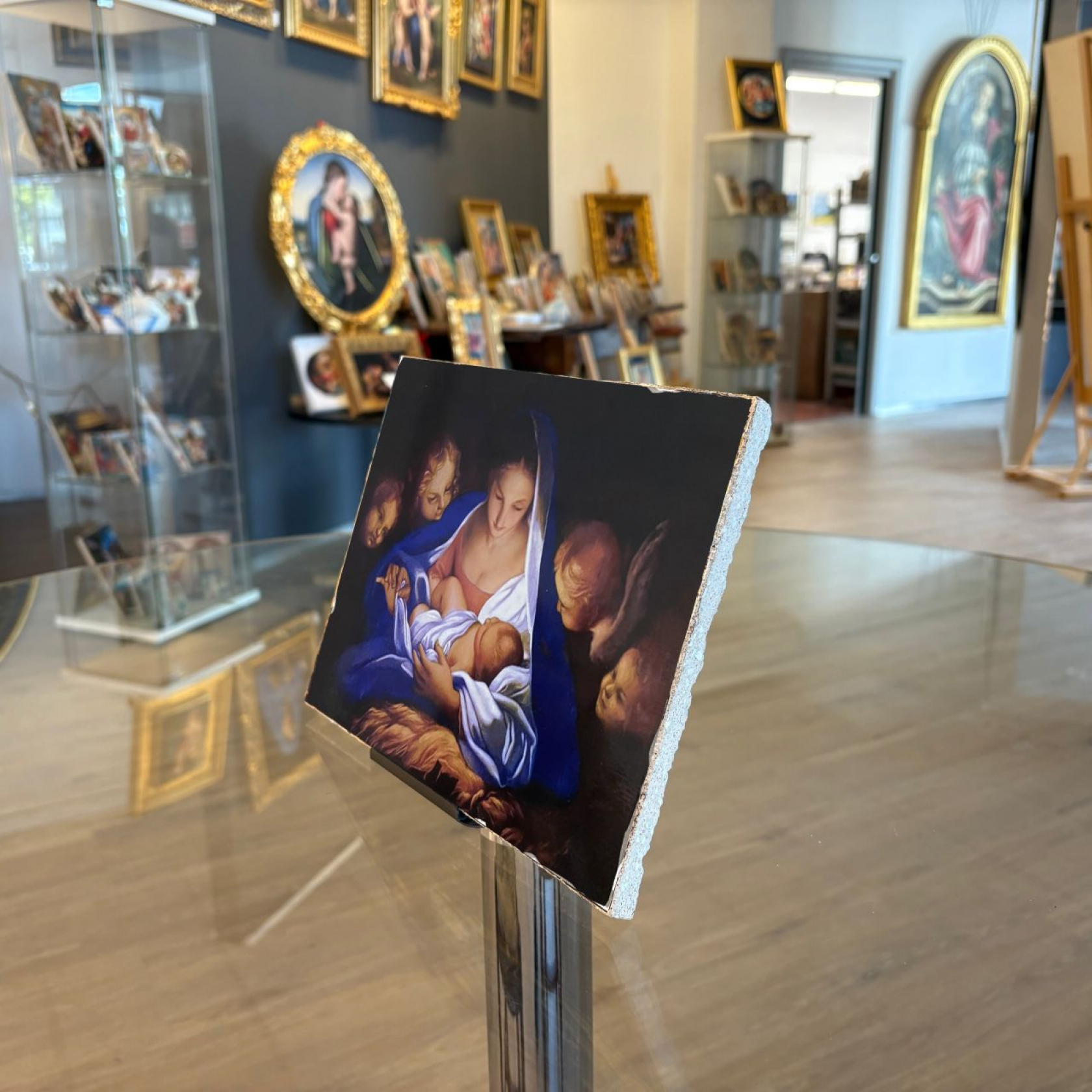 The work does not follow the scheme of the classic Nativity, but prefers a different cut and a very precise selection of characters and symbols. The artist conceives a rather scenic cut, a close-up that shows an interesting balance in the conception of the composition of the image. In the center, the Virgin bends over the Child. Around her, adoring cherubs crown this idyll. She is dressed according to tradition with a tunic and cloak in red and lapis lazuli blue. The white veil underneath, a symbol of purity, wraps the baby in newborn swaddling. What is striking in this work is the tenderness of this mother's embrace, which crosses the gaze of the little Jesus, of which Maratta depicts in the foreground the head and chubby cheeks that give him a very bright realism. The background has no details of any kind, as it is designed to highlight only the main subjects. A work, therefore, courtly and harmonious in composition, but at the same time very realistic in model, which effectively and tenderly recounts this moment in the life of Jesus.