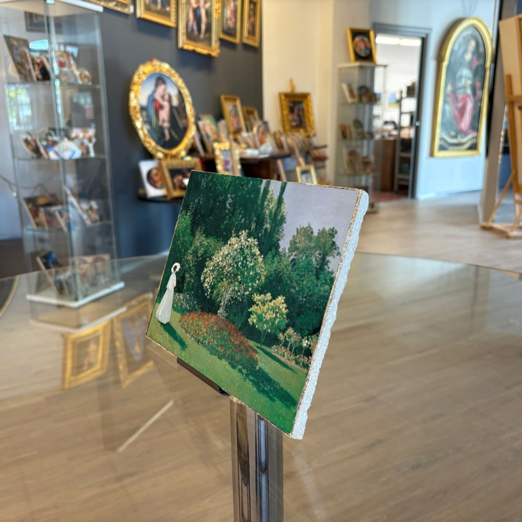 It is one of Monet's first works from 1867, characterized by by bright colors, by the absence of black and by a feeling of spontaneity that reflects the first steps of this new way of paint. Sunlight highlights the colors of the garden and highlights the pure white of the woman's dress on the left.