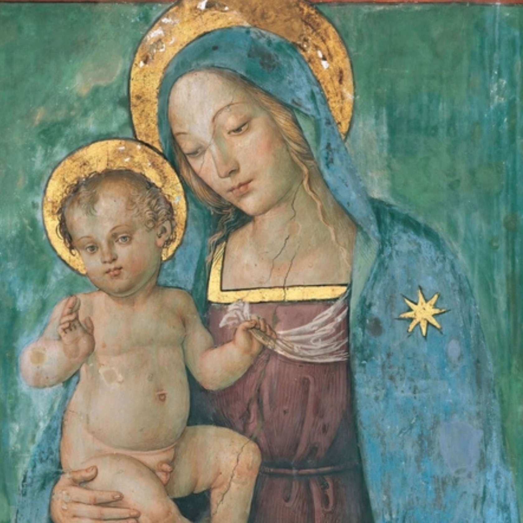 In the work, the Child Jesus is depicted with curly and flowing hair - typical of Pinturicchio who in those years abandoned iconography with a pearl-edged bonnet derived from the example of the painter Fiorenzo di Lorenzo - while with his left hand he tenderly clings to a flap of his Mother's robe. The right hand, on the other hand, is in a blessing position towards the observer of the fresco, to whom Christ himself turns his gaze. The frontal setting and solemn plasticism refer to the Tuscan example, filtered by Umbrian painters such as Perugino and Fiorenzo di Lorenzo himself. The dominant colors are blue, which represents transcendence and the divine, and red, at the same time the color of royalty and an omen of the Passion. A golden star stands out on Mary's mantle, a symbol of the woman who dresses herself in heaven.