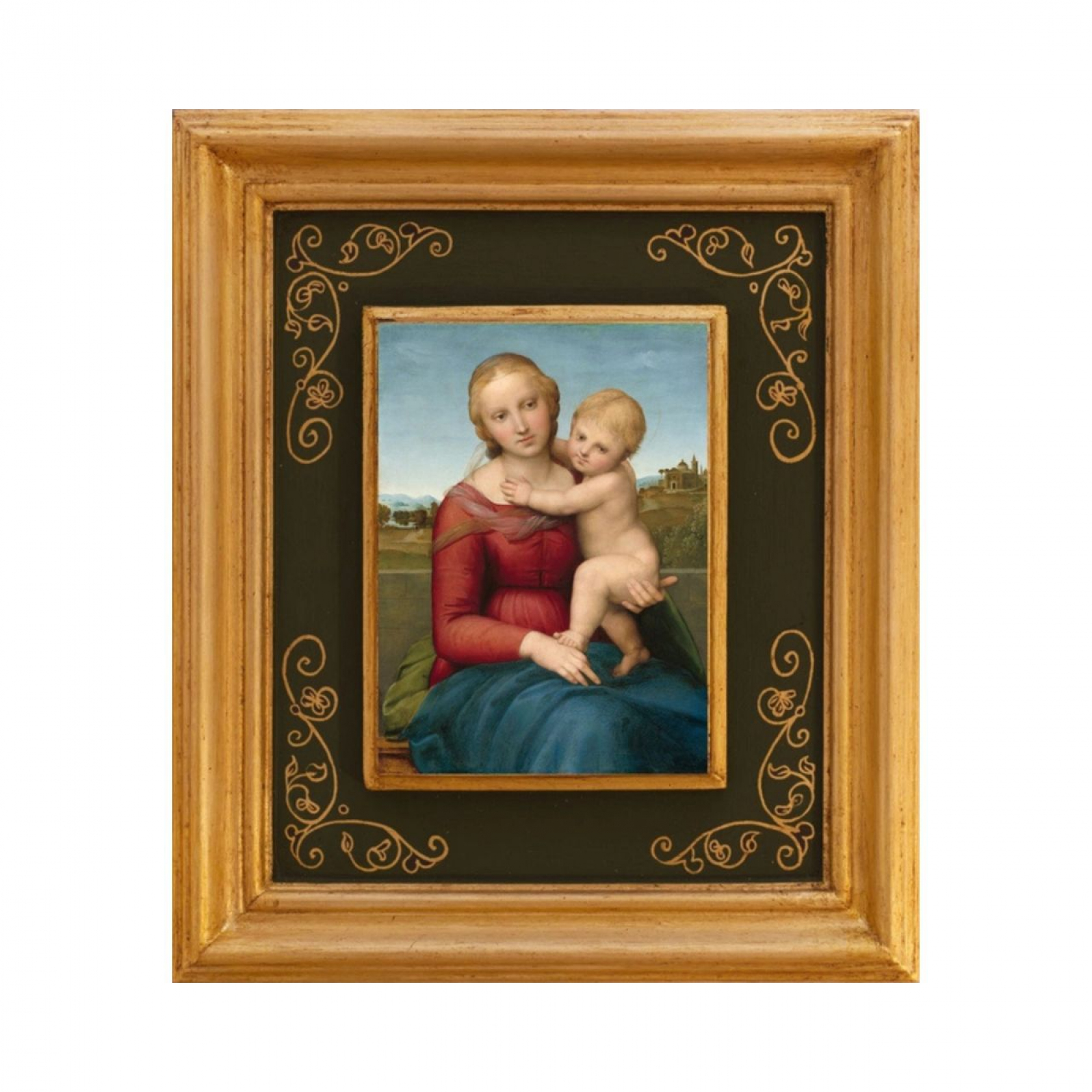 The work shows the Madonna seated half-length with the Child in her lap who is about to embrace her. Iconographically it is usually referred to a derivation of the Grand Duke's Madonna, with a lively interaction between mother and son in gestures. The bust of Mary is rotated to the right, while the body of Jesus twists in the opposite direction, wrapping his mother around his neck affectionately. The gazes of both are turned to the viewer and their faces are created by analogies, starting with the soft blonde hair of both. Further away, the mist makes everything very clear, in blue tones.