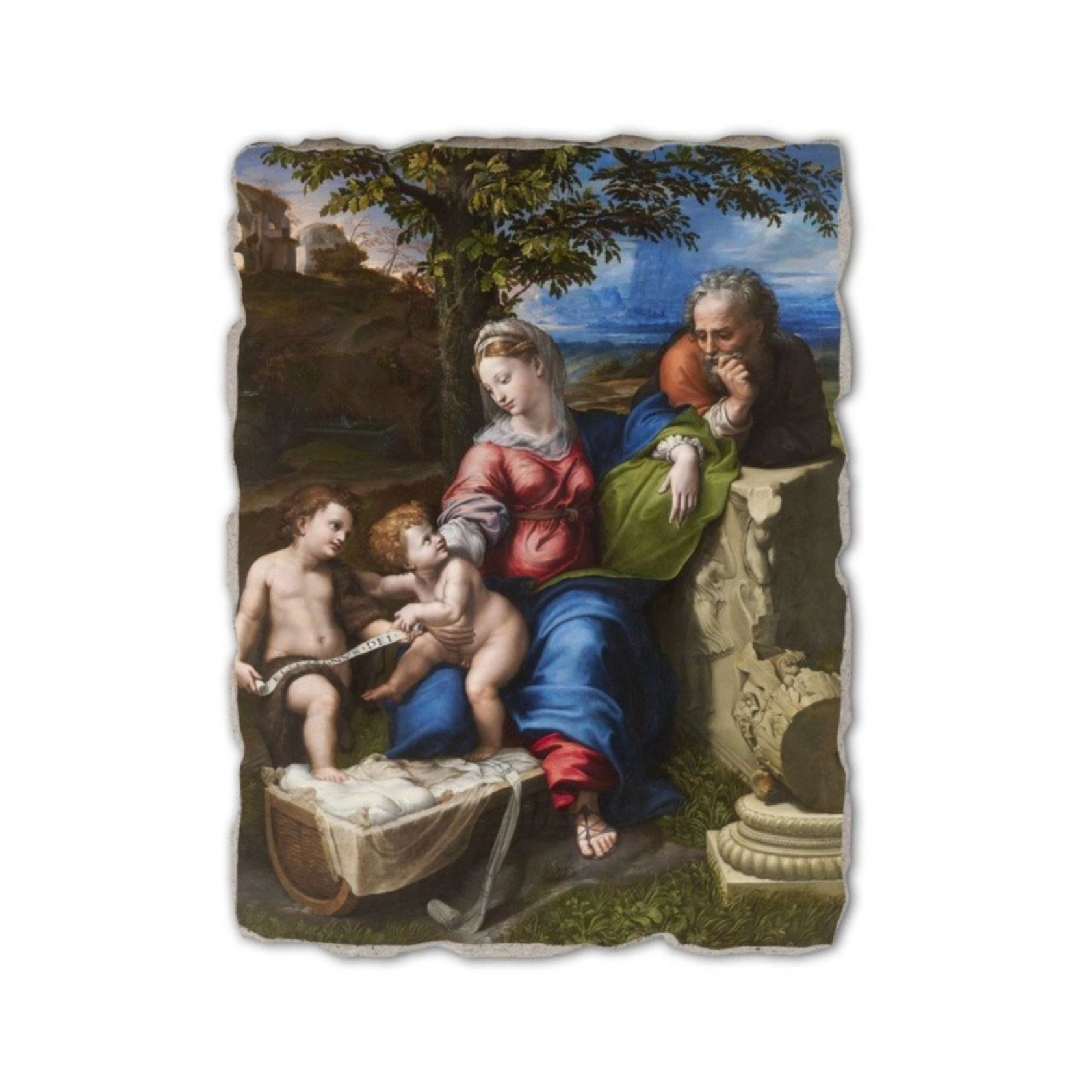 Leaning on a classical ruin, St. Joseph looks with an absorbed expression at the Virgin Mary with the Christ Child in her lap. Jesus, in turn who is playing with St. John, receives from him a scroll with the words Ecce Agnus Dei. Jesus seems to understand the significance of that message, pointing it to the mother with a smile, as a sign of acceptance of her destiny. Giovanni, on whom the typical attribute of the fur coat can be observed. hermit, rests one foot on the cradle of rushes full of cushions and soft sheets, with vivid material effects. The figures in this way are they are arranged diagonally rather than in the traditional pyramid. The landscape that surrounds the characters is reminiscent of that of the Tiber, the oak tree behind the main group gives its name at work and separates the figures from the landscape in the background. In the Christian doctrine, symbolizes the tree of life and also means salvation. The cross of Jesus Christ was built with its wood and, at the same time, starting from the Middle Ages, the iconography of the Madonna della Quercia spread.