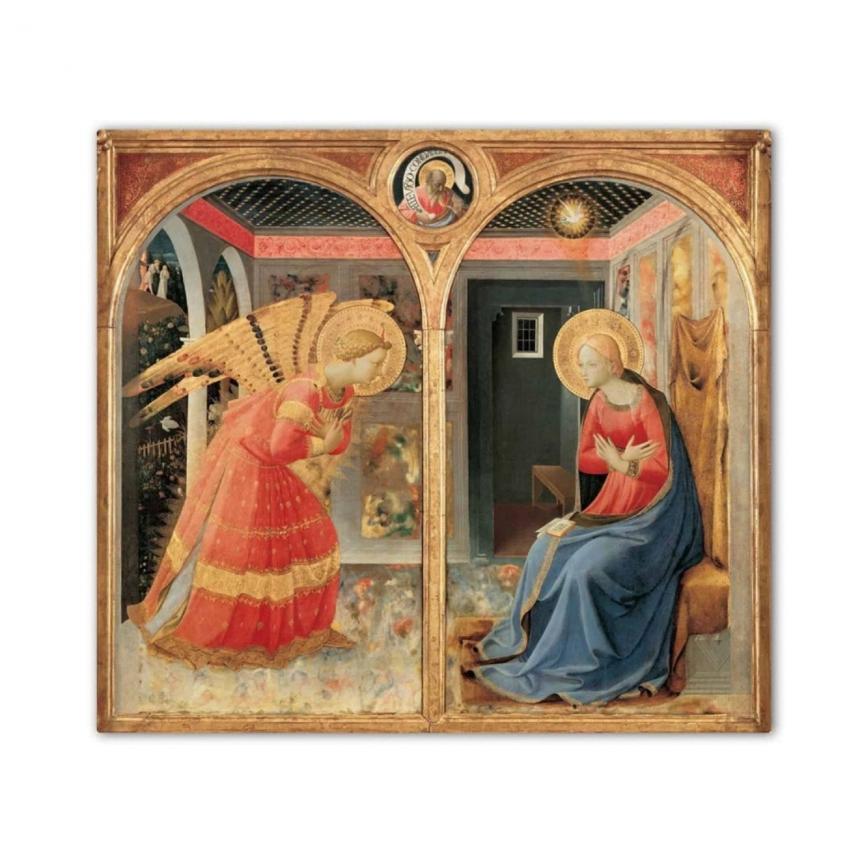 Capolavoro della collezione è l'Annunciazione di Guido di Piero, fra Giovanni da Fiesole detto Beato Angelico, proveniente dal convento di Montecarlo, dove è attestata dal 1630, ma in origine destinata ad altra sede di incerta ubicazione. L'opera, concordemente attribuita all'Angelico per l'altissimo livello artistico che la pone nel pieno della fase giovanile (1432-35) è una delle tre Annunciazioni su tavola dipinte dal frate domenicano insieme a quella per S. Domenico di Fiesole, al Museo del Prado a Madrid e a quella per S. Domenico a Cortona, al Museo diocesano cittadino. L'opera, nonostante gli elementi tardogotici, riflette le novità rinascimentali di Masaccio e Brunelleschi, come l'impianto prospettico perfettamente centrale con la bella loggia ad arcate a tutto sesto lateralmente aperta sul giardino dell'Eden e sullo sfondo l'austero cubicolo di Maria con la finestra ferrata che accentua il senso di profondità. L'opera, vera omelia figurativa, è ricca di simboli cristologici e mariani: dalla colonna cristica al centro, simbolo dell'albero della croce e della vita, allo splendore dell'oro, emblema della luce divina alla palma, simbolo della vittoria sul peccato e sulla morte, ma anche allusione alla passione di Cristo e al martirio. Tipicamente mariani sono l'hortus conclusus delimitato dal recinto, che simboleggia la Verginità di Maria e la varietà di fiori tra cui, oltre al classico giglio, posto in secondo piano e non in mano all'angelo o al centro della composizione, le primule, che alludono alla nuova Primavera della vita (l'Annunciazione si compie il 25 Marzo, nove mesi prima del Natale), le stelle alpine, figura di Maria, stella mattutina, il garofano rosso, simbolo di fidanzamento e per questo della sponsalità di Maria, l'amata del Cantico dei Cantici e il melograno, allusione alla nuzialità feconda della Madre del Signore. Le recenti indagini riflettografiche hanno rivelato la grande padronanza e sicurezza del pittore nel disegno preparatorio, deciso e privo di ripensamenti. Tuttavia è probabile che ad una prima versione, più sobria e tradizionale con la loggia aperta tipica delle annunciazioni, abbia fatto seguito un adattamento ai nuovi gusti rinascimentali, con la decorazione delle pareti con sfumati effetti marmorei che, al di là dello scopo ornamentale, hanno un profondo senso simbolico, allusivo alla mutevolezza e peccaminosità del mondo, cangiante e multiforme rispetto all'immobilità e simmetria del cielo stellato della volta, emblema della perfezione divina. Elemento di incredibile modernità, il pavimento nuvoloso e indefinito come fosse acquerellato, che l'arcangelo Gabriele, messaggero di Dio, pare appena sfiorare, quasi a non voler contaminare la sua natura divina, è in realtà simbolo di dispersione e peccato, da cui l'uomo grazie all'incarnazione è stato liberato. Tutto concorre a sottolineare come l'evento dell'Annunciazione si compia tra tempo e Eternità, terra e cielo, finito e infinito.