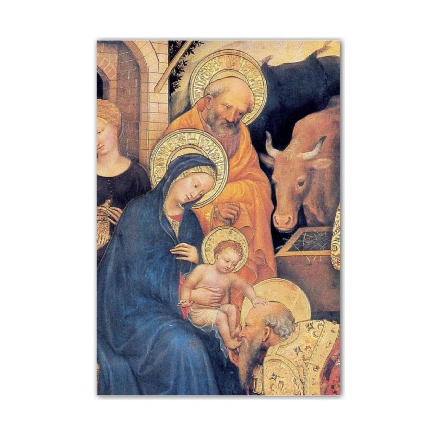 Al termine di un lungo viaggio, i Magi giungono al cospetto del Messia appena venuto al mondo guidati dalla stella cometa, e si prostrano ai piedi della Sacra Famiglia offrendo doni preziosi. Abbigliati con vesti straordinariamente ricche e alla moda, i Magi sono accompagnati da un corteo multietnico, di cui fanno parte anche animali esotici, che sottintendono la loro provenienza dal lontano Oriente. Il viaggio dei Magi, dall’avvistamento della stella cometa alla sosta al palazzo del re Erode, fino al ritorno in patria, è narrato in tre distinti episodi sullo sfondo della composizione, armonizzati nel paesaggio montuoso dell’orizzonte ma separati visivamente dalle tre arcate della cornice. La pala d’altare, dotata di una splendida carpenteria ornata nei pilastri laterali con fiori dipinti, è completata da una predella con storie dell’infanzia di Cristo: da sinistra la Natività, la Fuga in Egitto e la Presentazione al Tempio ; lo scomparto con la Presentazione al Tempio è una copia moderna dell’originale, conservato al Museo del Louvre a Parigi. Il dipinto fu commissionato dal ricco banchiere e raffinato amante delle arti Palla Strozzi per la cappella di famiglia situata nella sacrestia della chiesa di Santa Trinita a Firenze. La tavola, che reca la firma del maestro e la data 1423, costituisce il capolavoro di Gentile, il più importante esponente del Gotico internazionale in Italia, che dimostra una straordinaria padronanza tecnica nell’impiego di particolari lavorazioni, come attesta la cospicua quantità di foglia metallica, sbalzata parzialmente a rilievo per conferire tridimensionalità ad oggetti come gli speroni del cavaliere o l’elsa della spada. Nella predella, al posto del fondo oro di tradizione medievale, le scene presentano il cielo azzurro, indice dell’interesse per la natura e dell’incipiente affermazione dei canoni culturali ed estetici del Rinascimento.