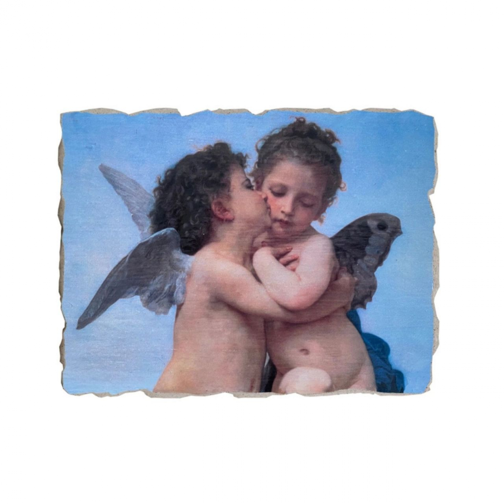 Nella versione di Bouguereau, Amore e Psiche sono due bimbi che si baciano. Amore, proprio come suggerisce la tradizione, ha delle bellissime ali piumate, mentre Psiche, per distinguersi dal suo amante, ha delle ali da farfalla. L'ambiente che li circonda ' composto unicamente da tante nuvole, quasi come se si trovassero in Paradiso o sulla via per l'Olimpo degli dei greci. I due piccoli protagonisti sono felici e non hanno alcuna preoccupazione. Sono ritratti mentre sono appoggiati su un piccolo telo colore blu scuro che spezza i toni del paradiso che li circonda. Sono questi i particolari che rendono questo quadro una delle immagini di bambini che si baciano pi' belle di tutta la storia dell'arte.