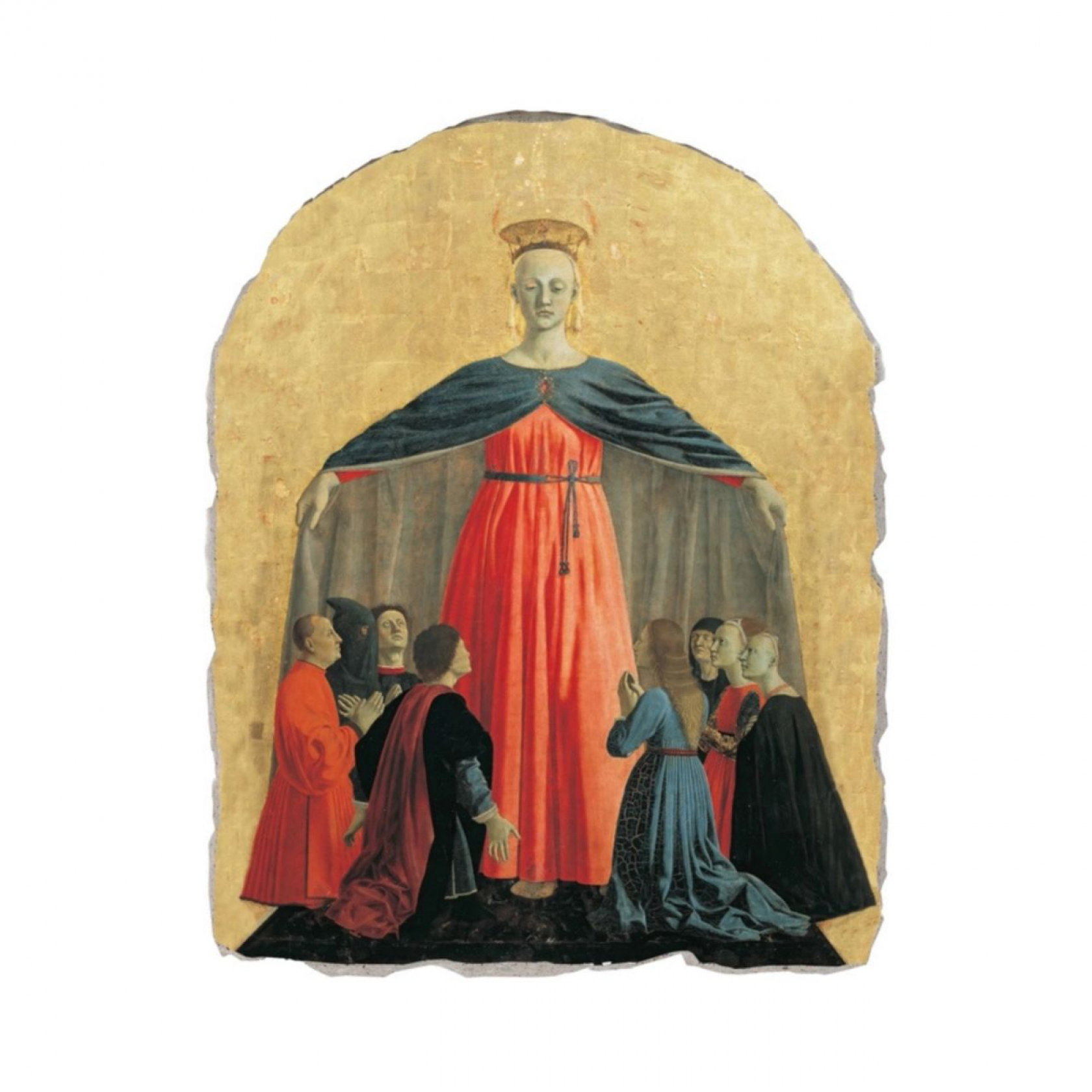 La scena rappresenta la Madonna al centro, in piedi, che apre il suo grande mantello per accogliere e proteggere i fedeli inginocchiati sotto di lei. La Vergine ha un'espressione calma, solenne e distante, tipica dello stile di Piero della Francesca, che cerca di trasmettere un senso di divina autorità e umanità insieme.