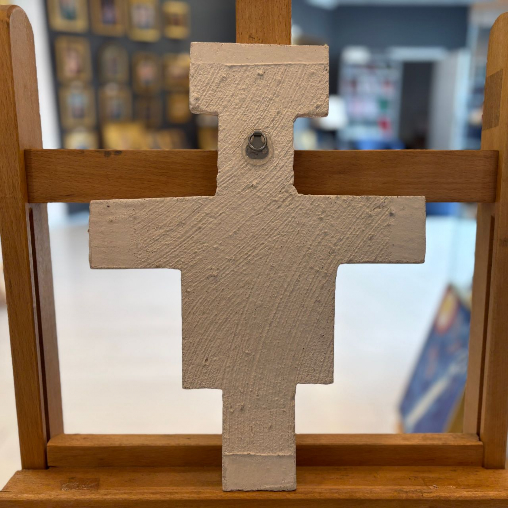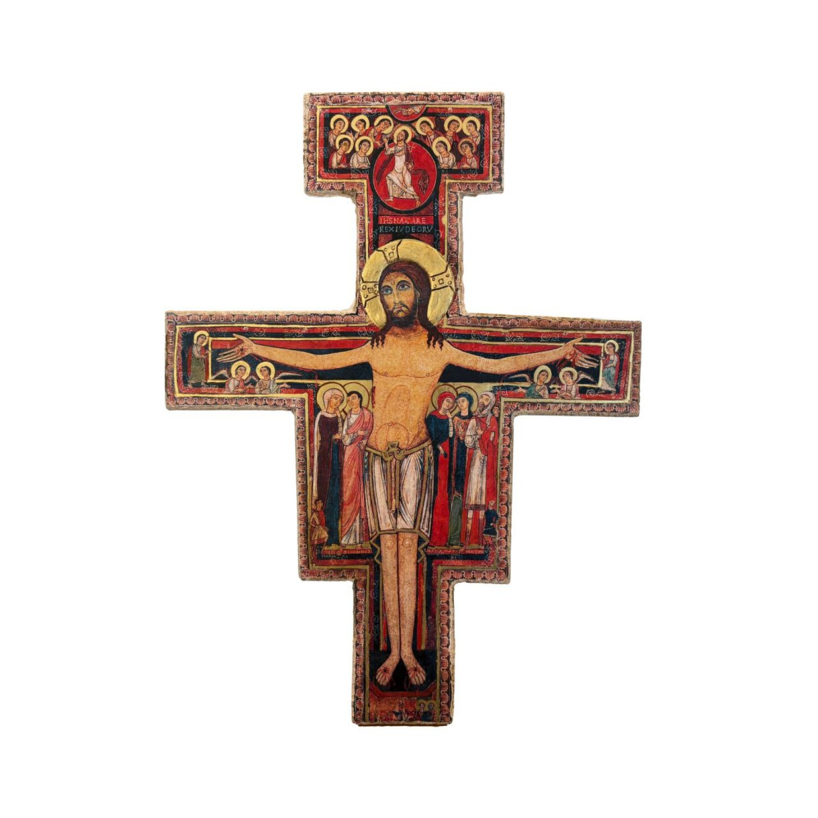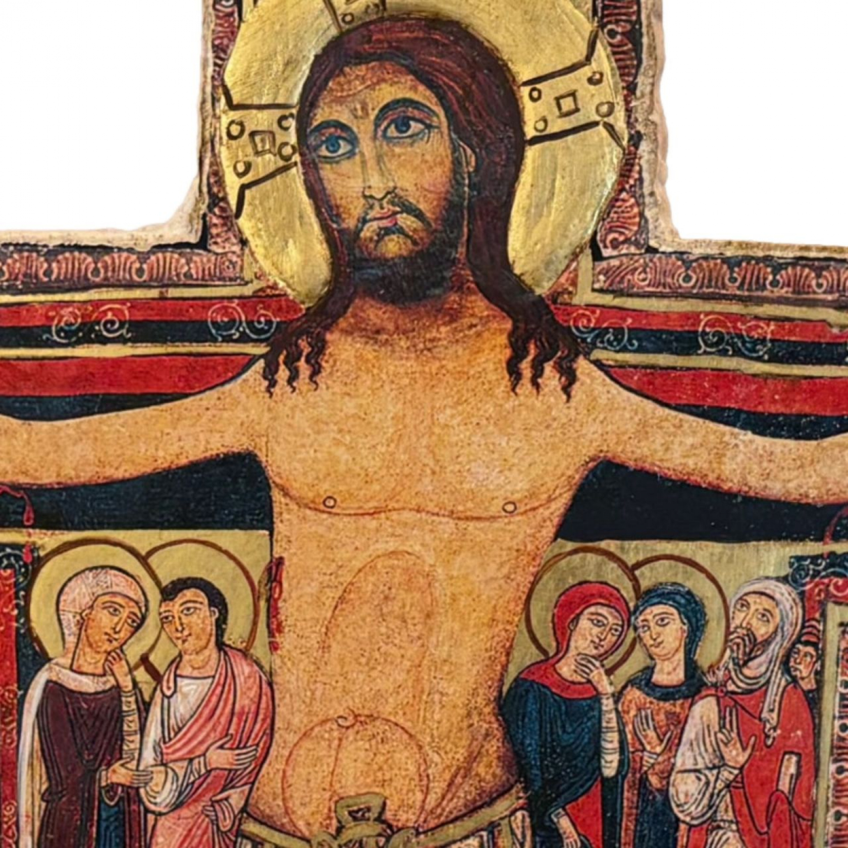 Gesù è rappresentato contemporaneamente ferito e forte. Egli non è morto, sta dritto e risoluto. Siamo dinanzi all'iconografia del Christus triumphans (che trionfa sulla morte), e la sua aureola include già l'immagine della croce glorificata. Il colore luminoso del suo corpo contrasta col rosso scuro e il nero attorno e accentua l'importanza di Gesù. Mentre il Cristo è rappresentato nella sua piena statura tutte le altre figure sono rappresentate rimpicciolite. Sopra la testa è posta la scritta in latino (titulus crucis) con delle abbreviazioni (Gesù nazareno re dei giudei).