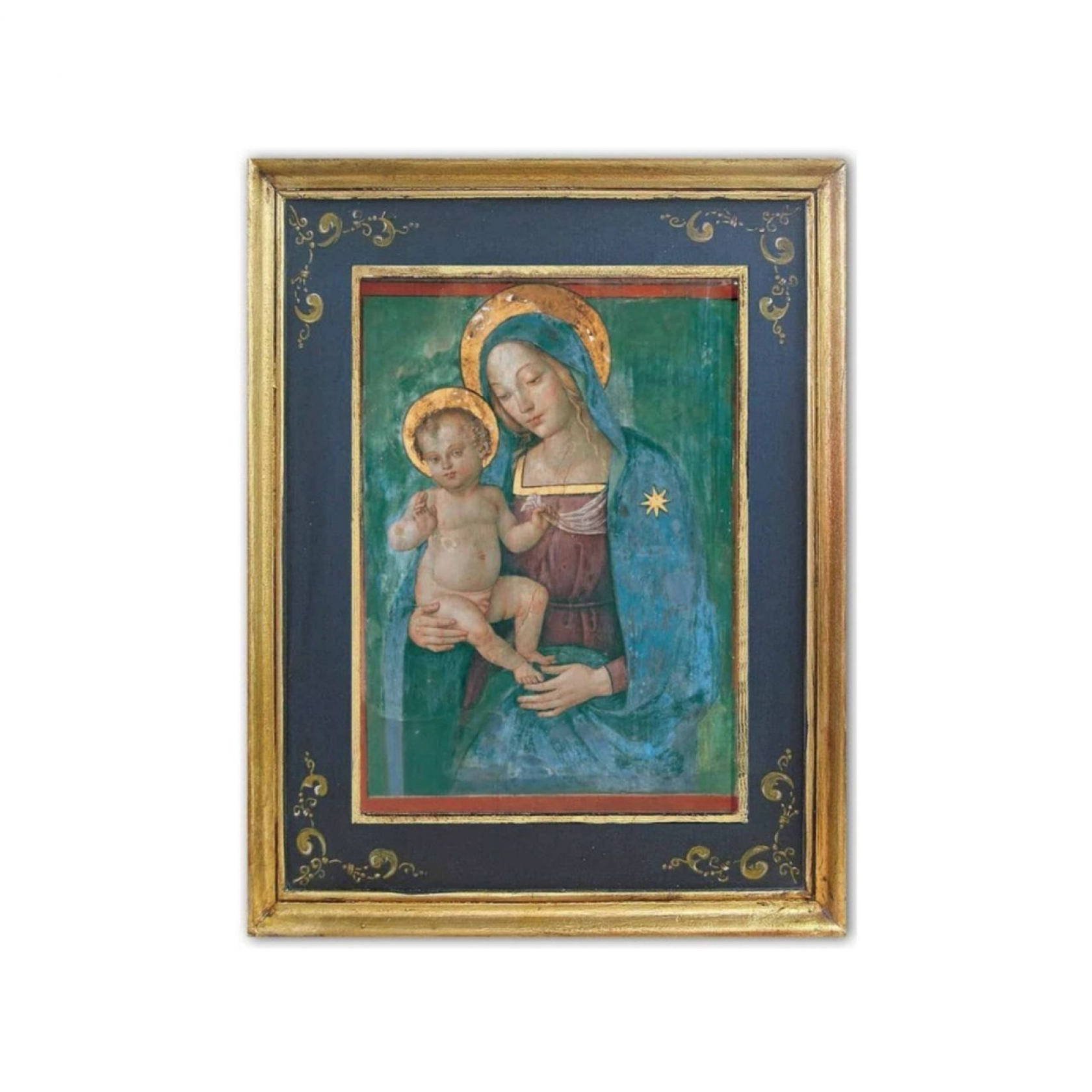 Nell’opera, Gesù Bambino viene raffigurato con la capigliatura riccia e fluente - tipica del Pinturicchio che proprio in quegli anni abbandonò l'iconografia con la cuffietta bordata di perle derivata dall'esempio del pittore Fiorenzo di Lorenzo - mentre con la mano sinistra si aggrappa teneramente ad un lembo di veste della Madre. La mano destra, invece, è in posizione benedicente verso chi osserva l'affresco, a cui Cristo stesso rivolge lo sguardo. L'impostazione frontale e il solenne plasticismo rimandano all’esempio toscano, filtrato da pittori umbri quali Perugino e lo stesso Fiorenzo di Lorenzo. I colori dominanti sono l'azzurro, che rappresenta la trascendenza ed il divino, e il rosso, al contempo colore della regalità e presagio della Passione. Spicca una stella dorata sul manto di Maria, simbolo della donna che si veste di cielo.