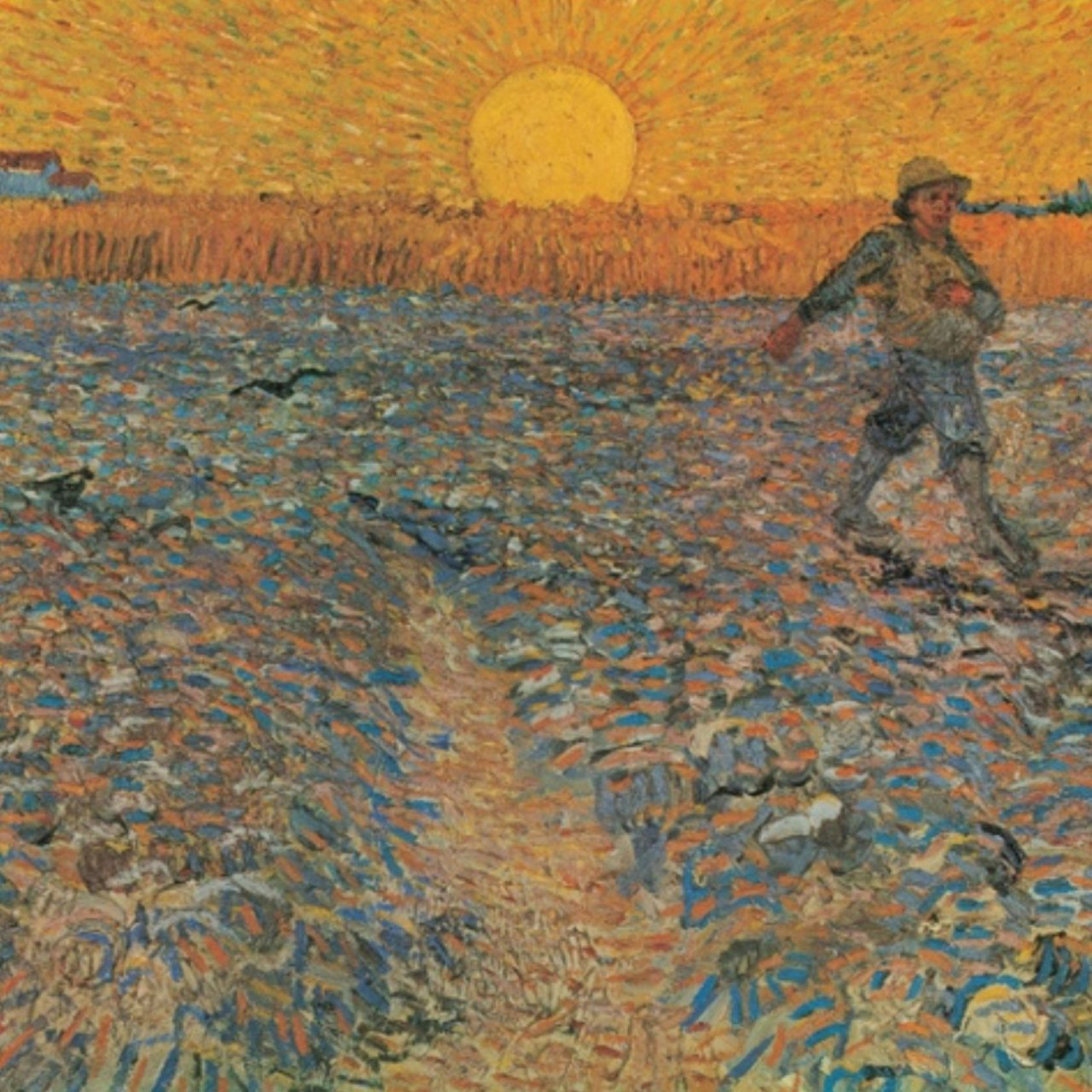 Un contadino percorre un grande terreno nel quale si inoltra un piccolo sentiero sterrato. Il seminatore avanza verso destra spargendo i semi. Con la mano sinistra invece tiene sulle spalle un fagotto dal quale attinge per seminare. Indossa abiti da lavoro e un cappello che lo protegge dal sole. Il terreno è stato arato e le zolle coprono interamente il suolo. Alcuni uccelli accorro per nutrirsi dei semi appena caduti. Sullo sfondo inoltre si alzano le spighe dorate non ancora mietute. A destra, oltre gli steli si intravede la sommità degli alberi di un boschetto. A sinistra invece una piccola casa e due alberelli sembrano galleggiare sul grano. Al centro infine il grande disco del sole tramonta e illumina di giallo l’intera scena.