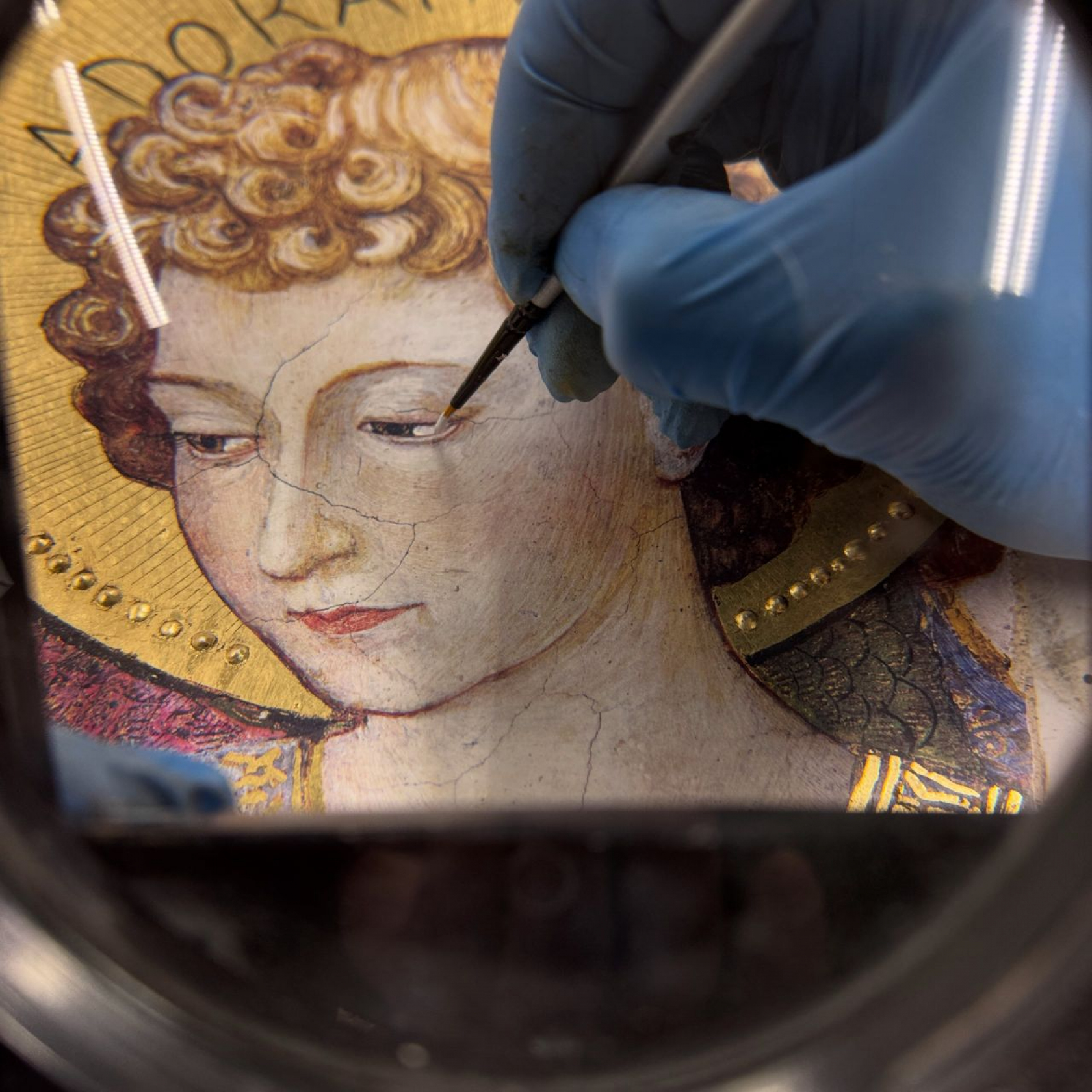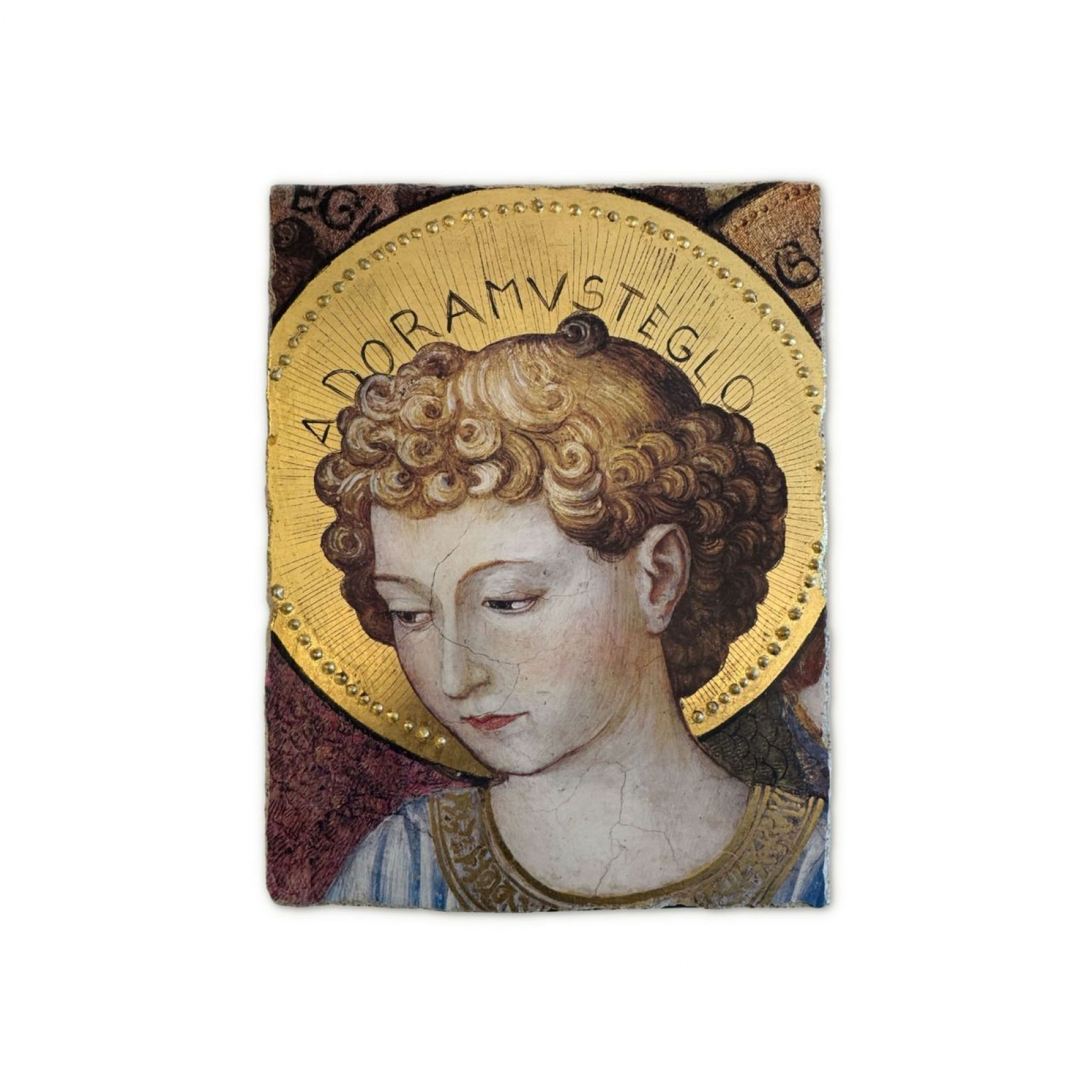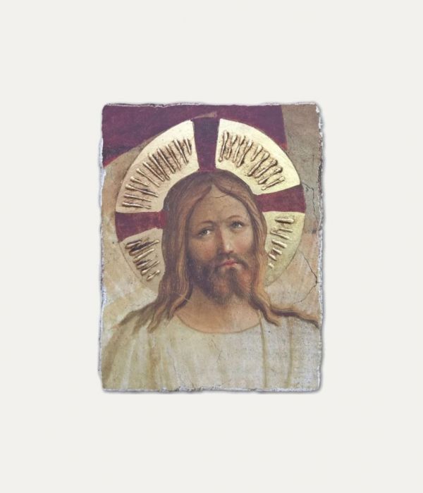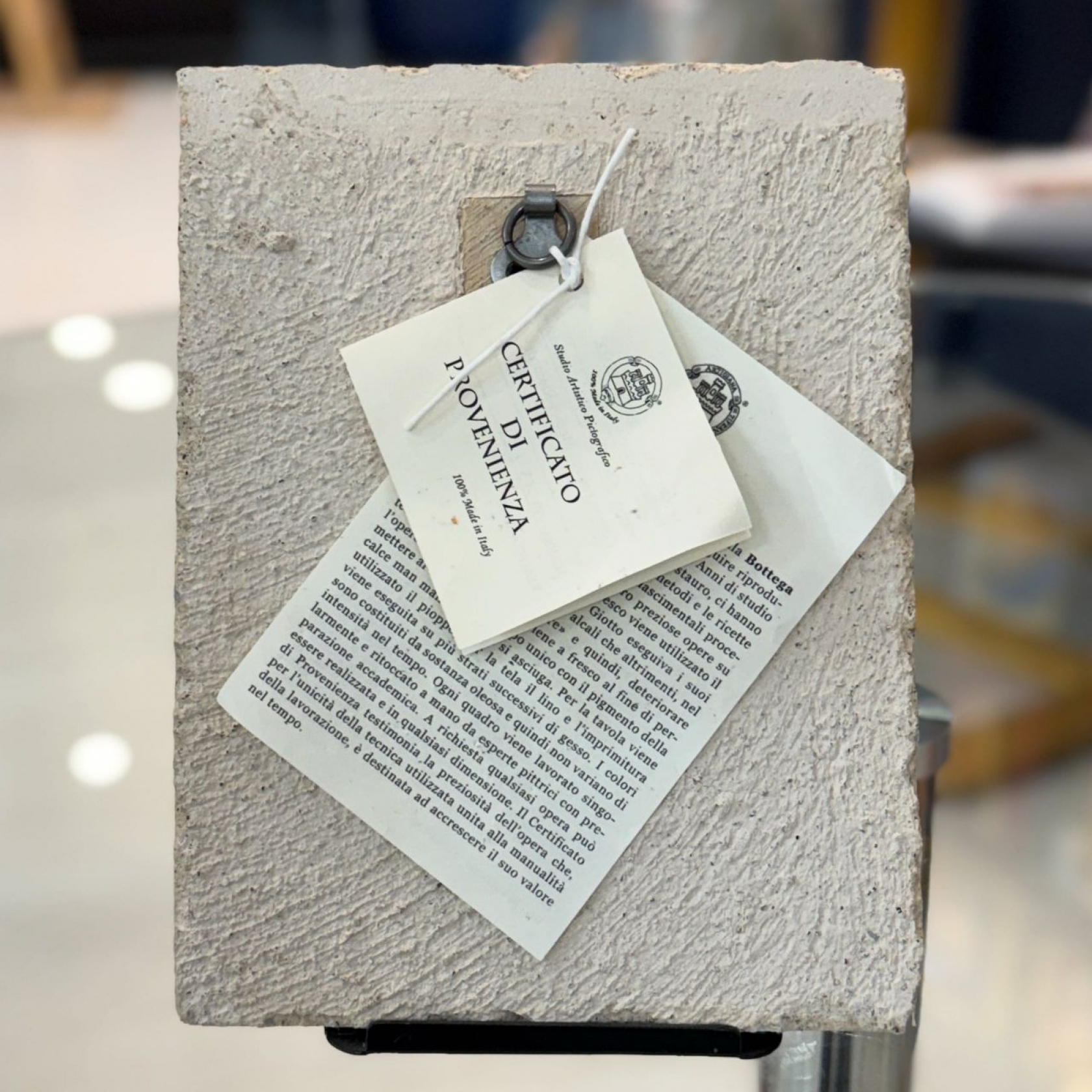 Pictografia a fresco su calce categoria “Retouch”. Ritocco a mano con terre a base di ossidi. Realizzato sulla base ancora fresca per una durata nel tempo eccezionale. Lavorazione con lente di ingrandimento, rilievi in gesso a caldo, doratura in foglia oro/oro zecchino. Confezionato con elegante scatola bianca fondo + coperchio.