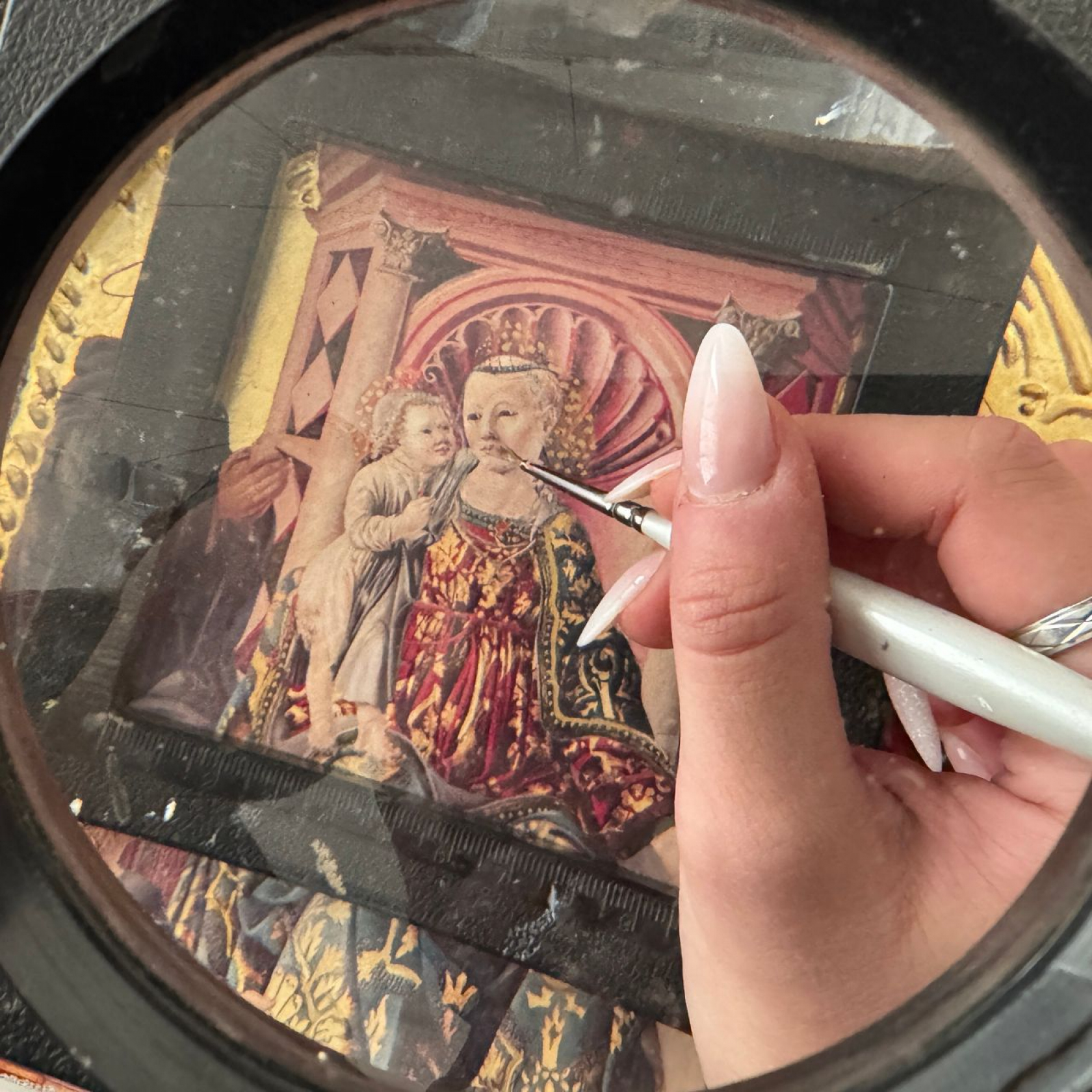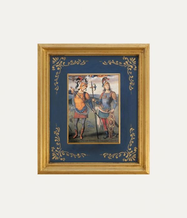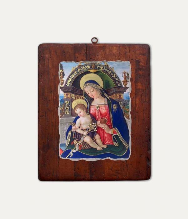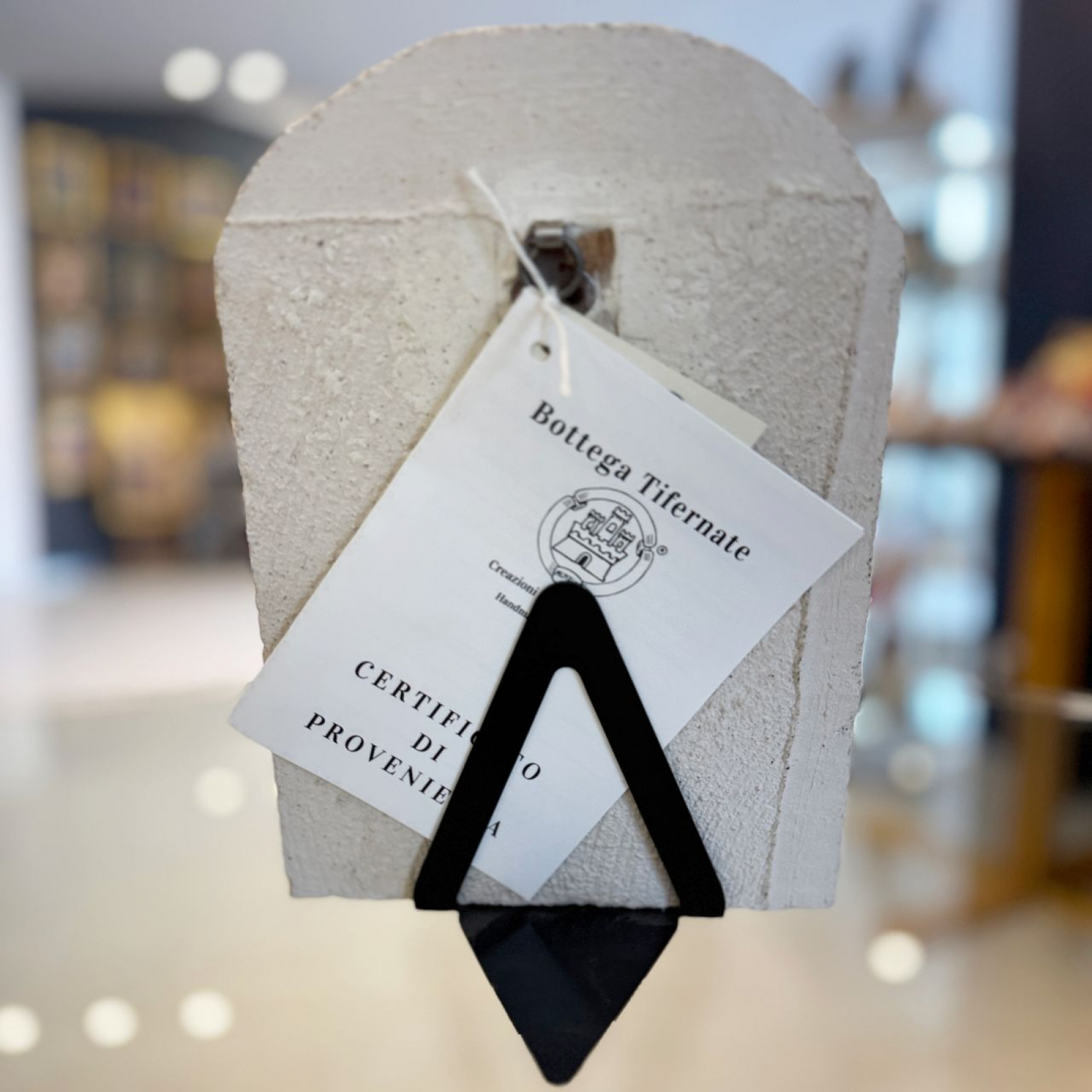 Pictografia a fresco su calce categoria “Retouch”. Ritocco a mano con terre a base di ossidi. Realizzato sulla base ancora fresca per una durata nel tempo eccezionale. Lavorazione con lente di ingrandimento, rilievi in gesso a caldo, doratura in foglia oro/oro zecchino. Confezionato con elegante scatola bianca fondo + coperchio.