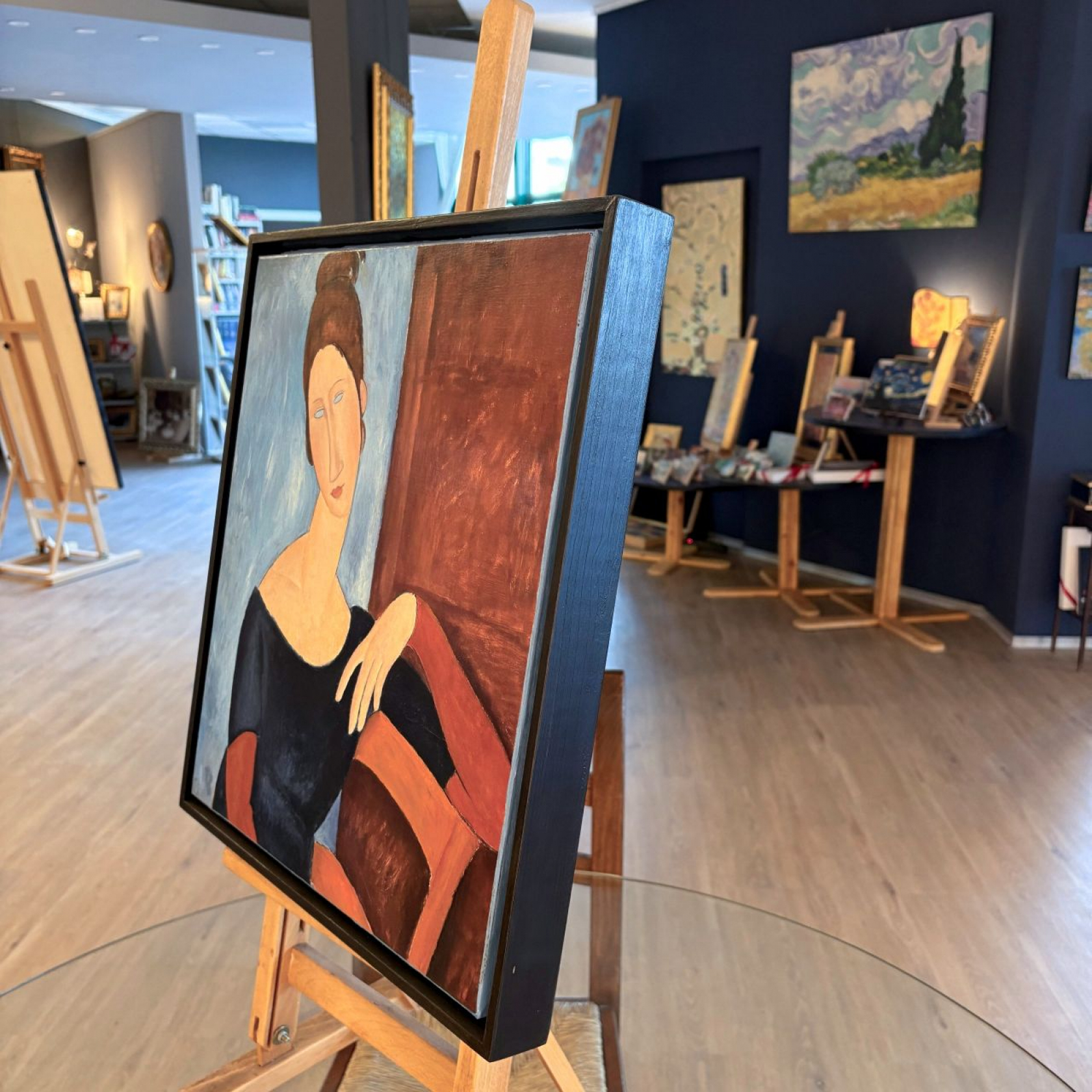L’opera ritrae Jeanne Hébuterne, compagna di Modigliani, in una posa assorta e malinconica, divenuta iconica della produzione del pittore. La figura femminile è resa con le consuete caratteristiche stilistiche dell’artista: volto allungato, occhi a mandorla privi di pupille, collo slanciato e linee sinuose, che contribuiscono a conferire alla figura una dimensione quasi astratta, sospesa tra idealizzazione e introspezione.