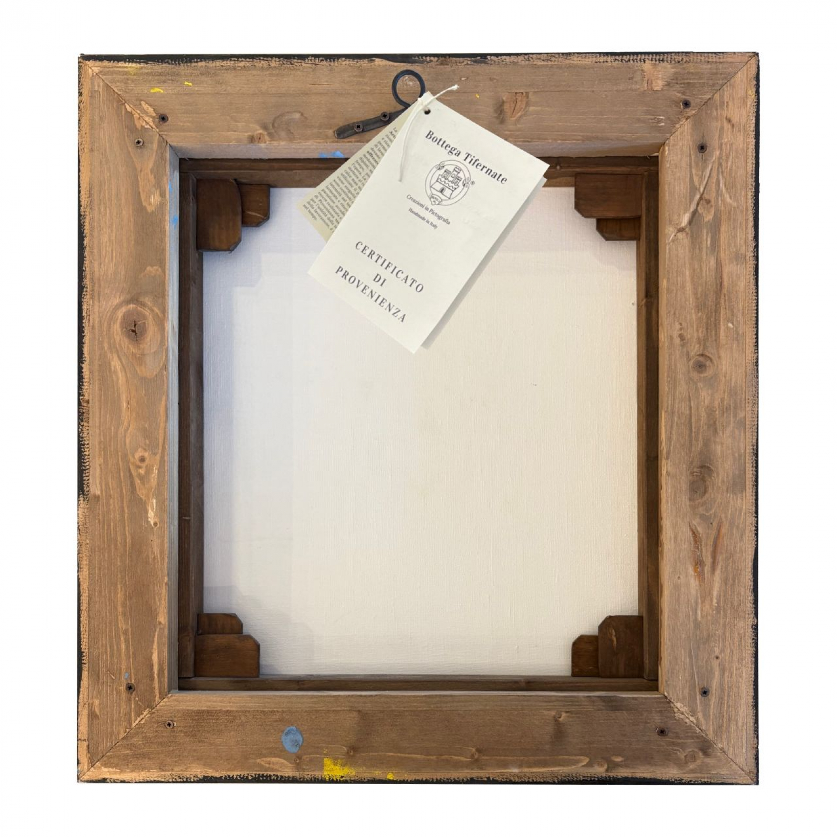 Pictografia a olio su tela con bordo colore categoria "Essential". Ritocco con colori Maimeri. Tela in lino montata su telaio; gancio a scomparsa per montaggio a parete. Spessore telaio mm 18. Confezionato con elegante scatola bianca fondo + coperchio.