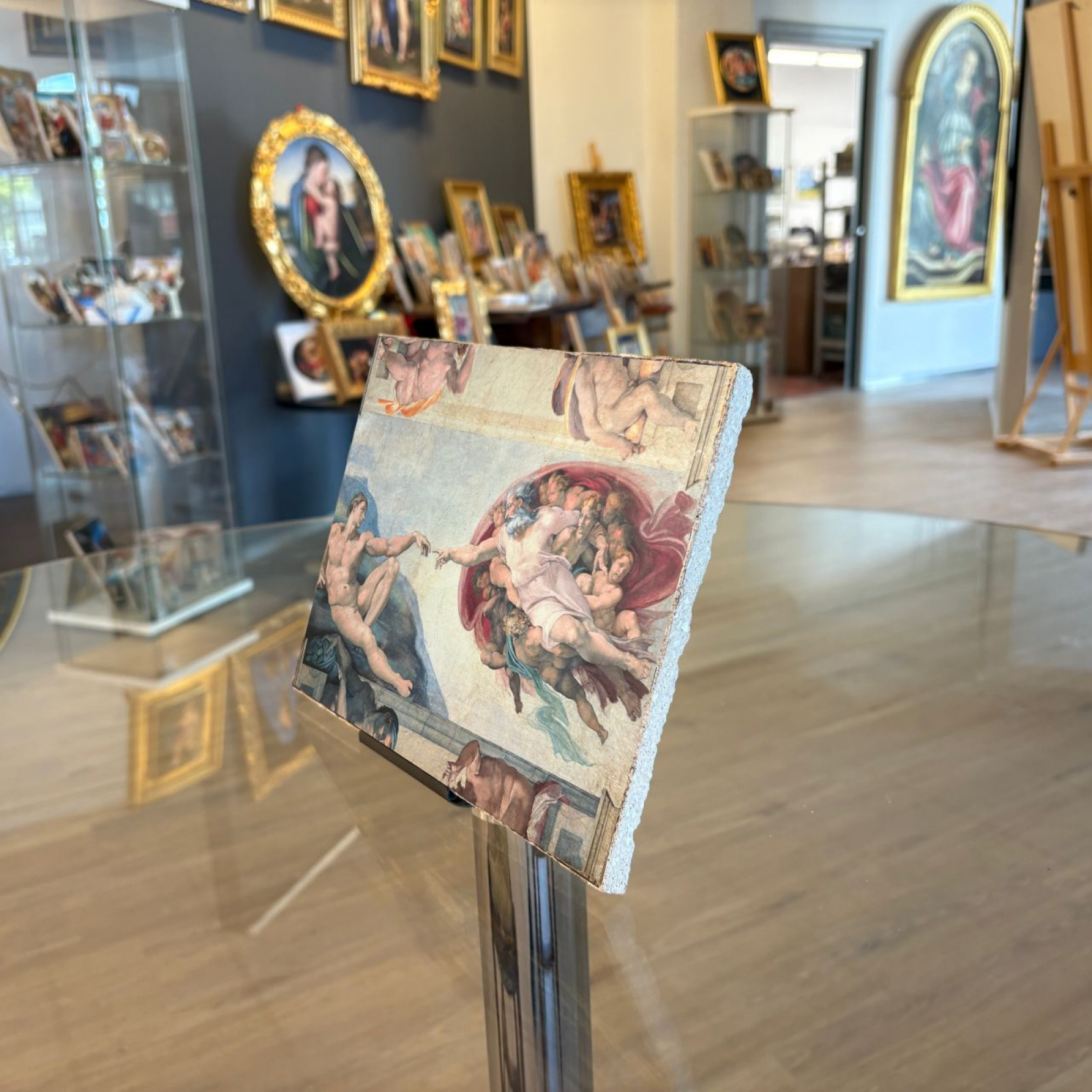 Dio è sospeso a destra all’interno di un nimbo sorretto da angeli e cherubini. A sinistra, invece Adamo è disteso su un prato che si affaccia su un pendio erboso. Il progenitore è semidisteso completamente nudo con il braccio poggiato sul ginocchio destro. Il braccio destro poggia a terra e tiene il busto sollevato. I suoi lineamenti sono quelli di un giovane uomo. Il corpo è forte e muscoloso. La sua gamba destra è distesa lungo il declivio mentre la sinistra è flessa. Adamo è rappresentato di profilo e prendendo vita osserva in direzione di Dio mentre solleva il braccio sinistro verso verso di Lui. Dio indossa un abito di color rosa ed è rappresentato disteso verso sinistra e sostenuto dagli angeli. La lunga barba e i capelli grigi sono mossi dal vento. Un ampio velo color porpora reniforme circonda gli angeli e Dio. Un sottile tessuto di colore verde trasparente è sospeso in basso e svolazza sotto all’angelo che sostiene l’Eterno. L’incontro tra Dio e Adamo avviene contro uno sfondo privo di dettagli.